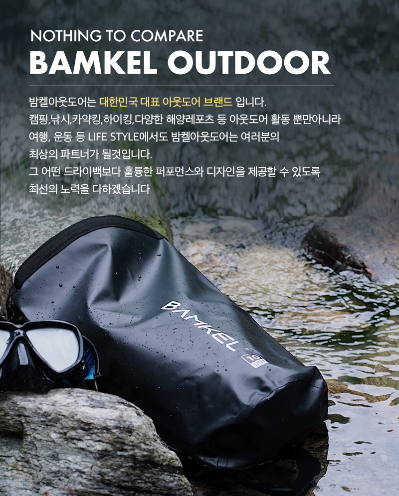 밤켈 아웃도어 방수 드라이백 백팩은 물속에 담그지 않는 이상 100% 완전 방수가 가능합니다.